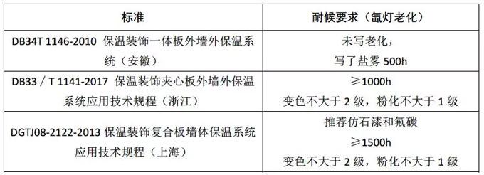 可以看出一體板的這些地方標準,相對來說弱化或規避了涂層耐候性的指標,而且未明確不同涂層種類的差別,一刀切的規定大約在1000~1500h的耐候性。這個指標很像多彩漆和氟碳漆的耐候性之間找了一個平衡點,其實主要原因在于我們現在定標準很多時候必須平衡參與的多個廠家的建議和利益,因此指標往往會折中處理。